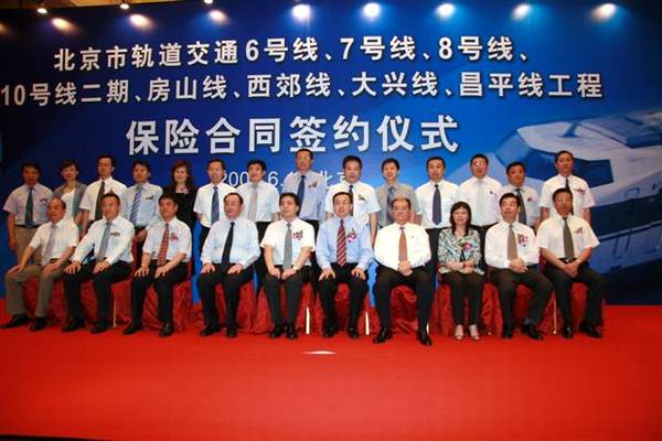 2009年6月11日下午,北京地铁新建项目工程保险签约仪式在北京香格里拉饭店举行。降彩石副总裁、北京市轨道交通建设管理公司吴宏建总经理以及华泰、江泰、世纪保险经纪公司和其他承保公司有关领导出席签约仪式。
